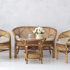 Комплект мебели для террасы 02/15 включает в себя: 2 кресла, плетеный двухместный диван, столик журнальный, подушки из материала улучшенного качества.